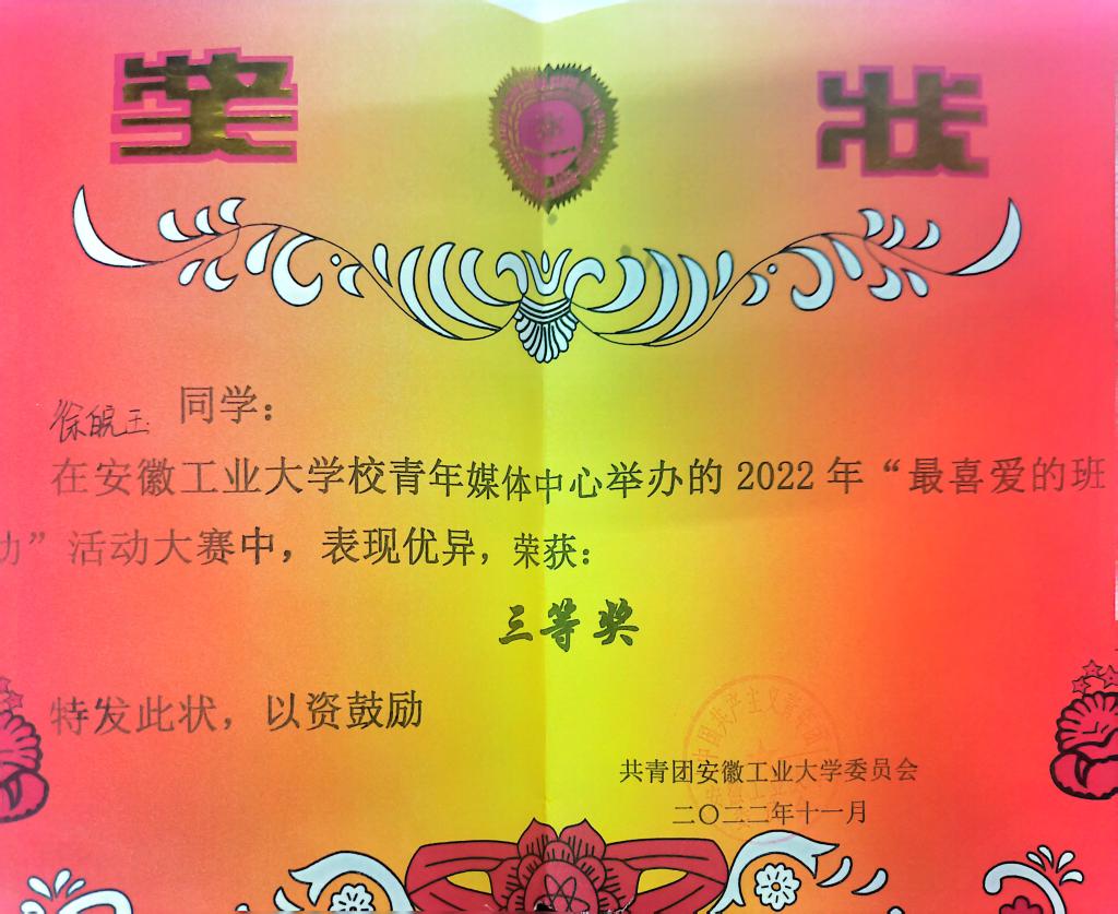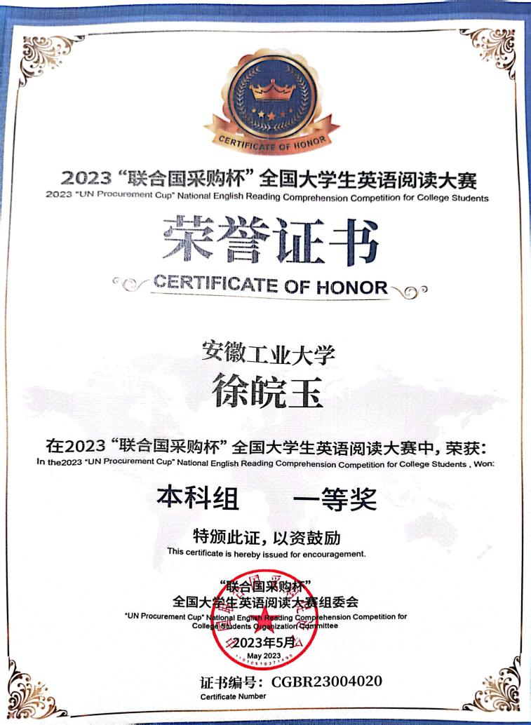 三年来,徐皖玉同学深知专业知识是实现理想的基石,始终以严谨的态度对待学习,综合成绩专业第一。曾获国家奖学金、校特等奖学金、东铭奖学金、中天钢铁奖学金,获校“三好员工标兵”、“三好员工”等荣誉称号,获:2020年“外研社杯”英语阅读大赛校赛一等奖,2021年“外研社杯”英语阅读大赛校赛一等奖,2023年“联合国采购杯”全国老员工英语阅读大赛本科组一等奖、2023年全国老员工英语竞赛二等奖,2023年第二届全国老员工英语语法挑战赛中国区三等奖等。