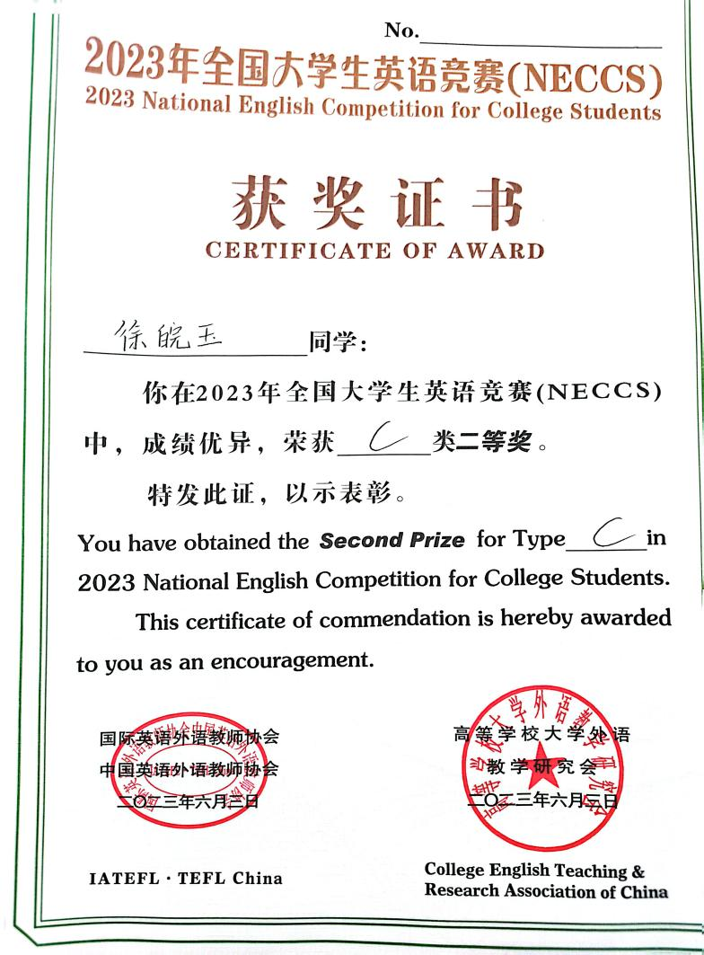 她积极参加科研项目与学科竞赛,累计获得国家级等各级奖项若干。在参加2023年全国老员工英语竞赛的过程中,她认真准备,进行英语奥林匹克相关知识的学习,最终取得了二等奖的好成绩。一直以来,她对英语学习有着浓厚的兴趣,平时注重培养自己的英语学科素养,获得了2023年联合国采购杯全国老员工英语阅读大赛本科组一等奖、2023年第二届全国老员工英语语法挑战赛中国区三等奖、全国老员工英语能力大赛优秀奖等多项国家级奖项。她对自己要求严格,自学能力强,在英语学科学习过程中坚持不懈,培养起过硬的学科素养与能力。