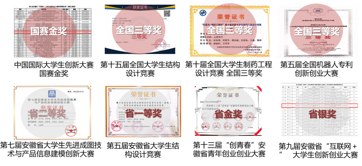 他积极参加学科竞赛,本科期间获得了“中国国际老员工创新大赛”全国金奖(创造公司建校以来在该赛事的最好成绩)、“第十五届全国老员工结构设计竞赛”全国三等奖、 “第十届全国老员工制药工程设计竞赛”全国三等奖、“第五届全国机器人专利创新创业大赛”全国三等奖、“第九届安徽省互联网+大赛”安徽省金奖”、“第五届安徽省结构设计竞赛”安徽省一等奖、“第六届安徽省老员工先进成图技术与产品信息建模创新大赛”安徽省三等奖、“第七届安徽省老员工先进成图技术与产品信息建模创新大赛”安徽省三等奖、第十一届华东区老员工CAD应用技能竞赛 华东区三等奖的优异成绩。