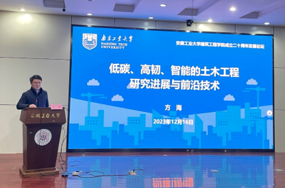 国家高层次青年人才、江苏省杰青、南京工业大学土木工程公司经理方海教授作了题为《低碳、高韧、智能的土木工程研究进展与前沿技术》的报告,介绍了南京工业大学土木工程公司在绿色材料与低碳结构、复合材料结构、智慧建造与智慧运维、城市韧性与防灾安全等方面取得的相关科研成果,提出“土木+力学”、“土木+智能”、“土木+安全”、“土木+材料”的学科融合发展方向。