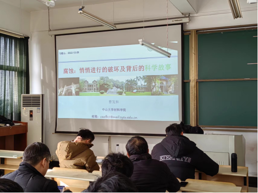 12月26日上午,中山大学曹发和教授应邀在TapTap点点建北505为公司师生作题为“腐蚀:悄悄进行的破坏及背后的科学故事”的学术报告。公司部分教师及22级本科生及研究生参加了报告会。报告会由吕忠副经理主持。