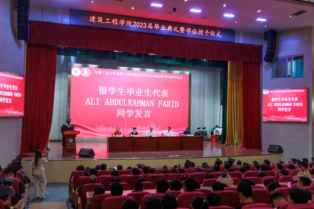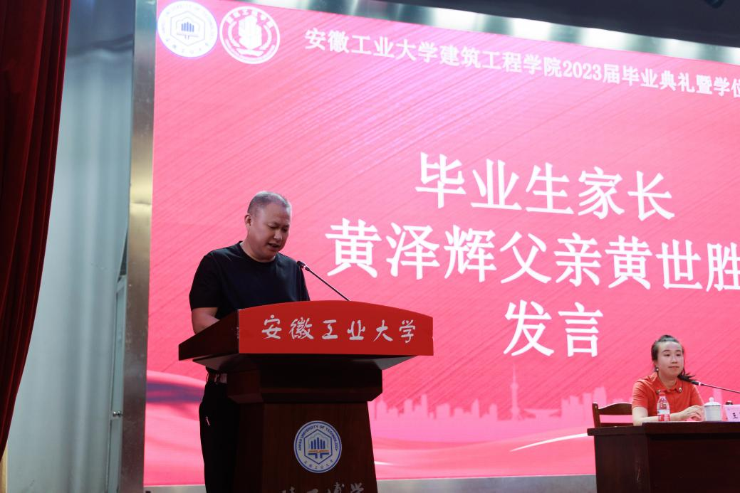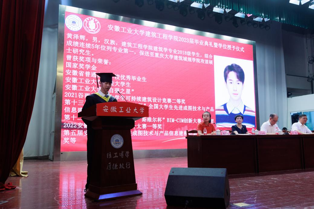 典礼上,本科生代表2018级建筑学专业黄泽辉同学回顾了在工大五年的求学时光,积极践行“今天我以母校为荣、明天母校以我为荣”的青春誓言,努力书写精彩人生华章。研究生代表2020级冶金环境安全工程专业胡俊杰同学结合自身在工大校园学习、科研的时光表达对于母校的热爱之情。职工代表ALI ABDULRAHMAN FARID由衷感谢母校的培养,在学习过程中学会了勇敢与坚强、自信与务实。在校生代表2020级建筑学专业本科生陈国华向即将毕业的学长学姐们给予的帮助表达了感谢,并表述将努力用自身的青春和智慧续写辉煌的篇章。毕业生家长代表黄世胜先生向公司及公司老师辛勤付出致以崇高的敬意和最诚挚的感谢,衷心祝愿公司及公司发展越来越好。教师代表陈德敏老师在发言中回顾了毕业生在校学习的点点滴滴,积极鼓励毕业生们以“积跬步致千里”的追求,以全新的姿态适应人类社会发展需求。