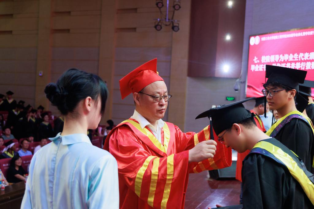 校院领导、导师依次为2023届毕业生代表拨动帽穗、颁发学位证书,并与他们合影留念。典礼在嘹亮的《建苑院歌》中圆满落幕。
