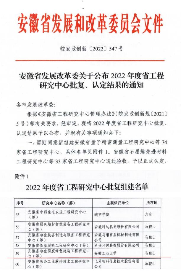 近日,安徽省发展与改革委公布了2022年度省工程研究中心批复、认定结果名单。由公司牵头申报的“安徽省冶金固废绿色建造工程研究中心(筹)”(以下简称“中心”)获批建设立项,这也是公司获批的第4个省发展与改革委工程研究中心。