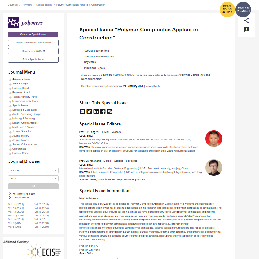 近日,国际知名MDPI出版集团旗下Polymers期刊向公司于峰教授发出邀请函,聘请其担任《Polymer Composites Applied in Construction》特刊客座编辑(Guest Editor)。