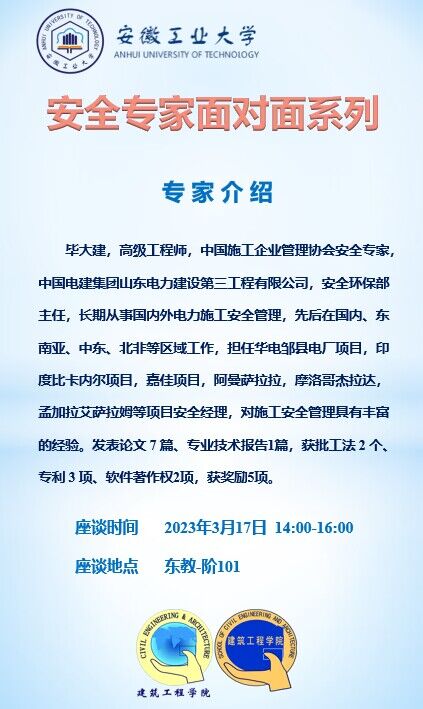 报告人简介:毕大建,高级工程师,中国施工企业管理协会安全专家,中国电建集团山东电力建设第三工程有限公司,安全环保部主任,长期从事国内外电力施工安全管理,先后在国内、东南亚、中东、北非等区域工作,担任华电邹县电厂项目,印度比卡内尔项目,嘉佳项目,阿曼萨拉拉,摩洛哥杰拉达,孟加拉艾萨拉姆等项目安全经理,对施工安全管理具有丰富的经验。发表论文 7 篇、专业技术报告1篇,获批工法 2 个、专利 3 项、软件著作权2项,获奖励5项。